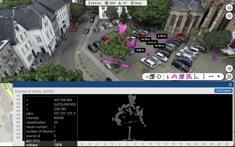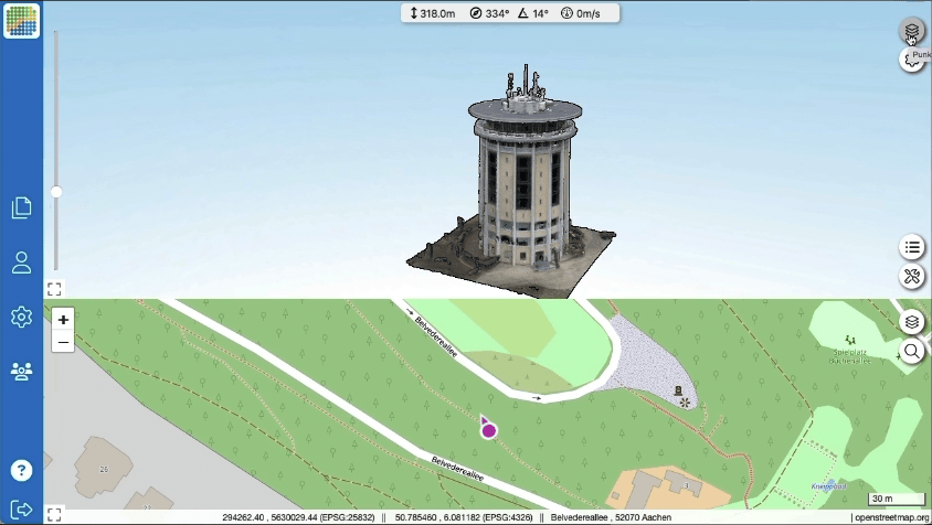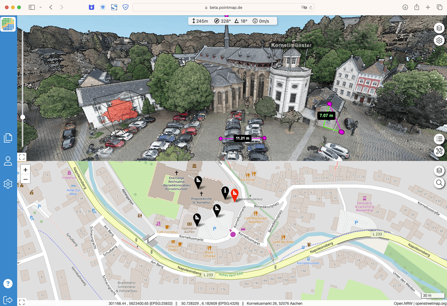 Dieser Datenbestand macht PointMap zu einem einzigartigen Geo-Planungstool, das erstmals Vermessungen öffentlicher Räume direkt vom PC aus ermöglicht. Vielfältige Anwendungen und Prozesse werden so erheblich schneller und effizienter umsetzbar.