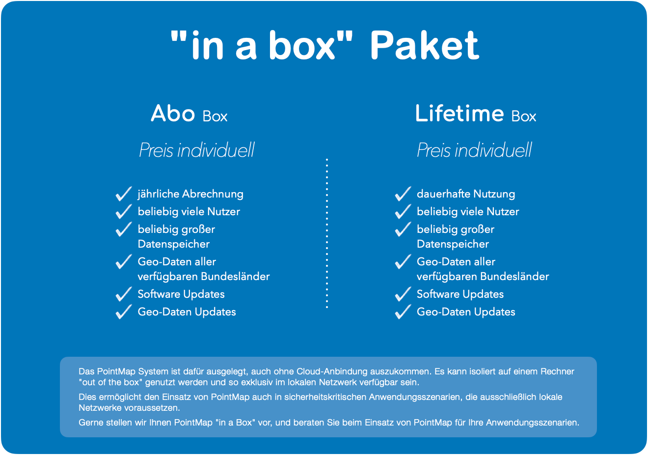 Alle PointMap Systemdaten, bestehend aus Geo-Basisdaten, Kunden-Importdaten, Kunden-Arbeitsdaten und Kunden-Stammdaten, werden ausschließlich in Rechenzentren in Nürnberg und Falkenstein gehostet.